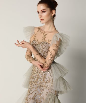 • Embroidery net fabric full sleeve dress with net pleating decoration